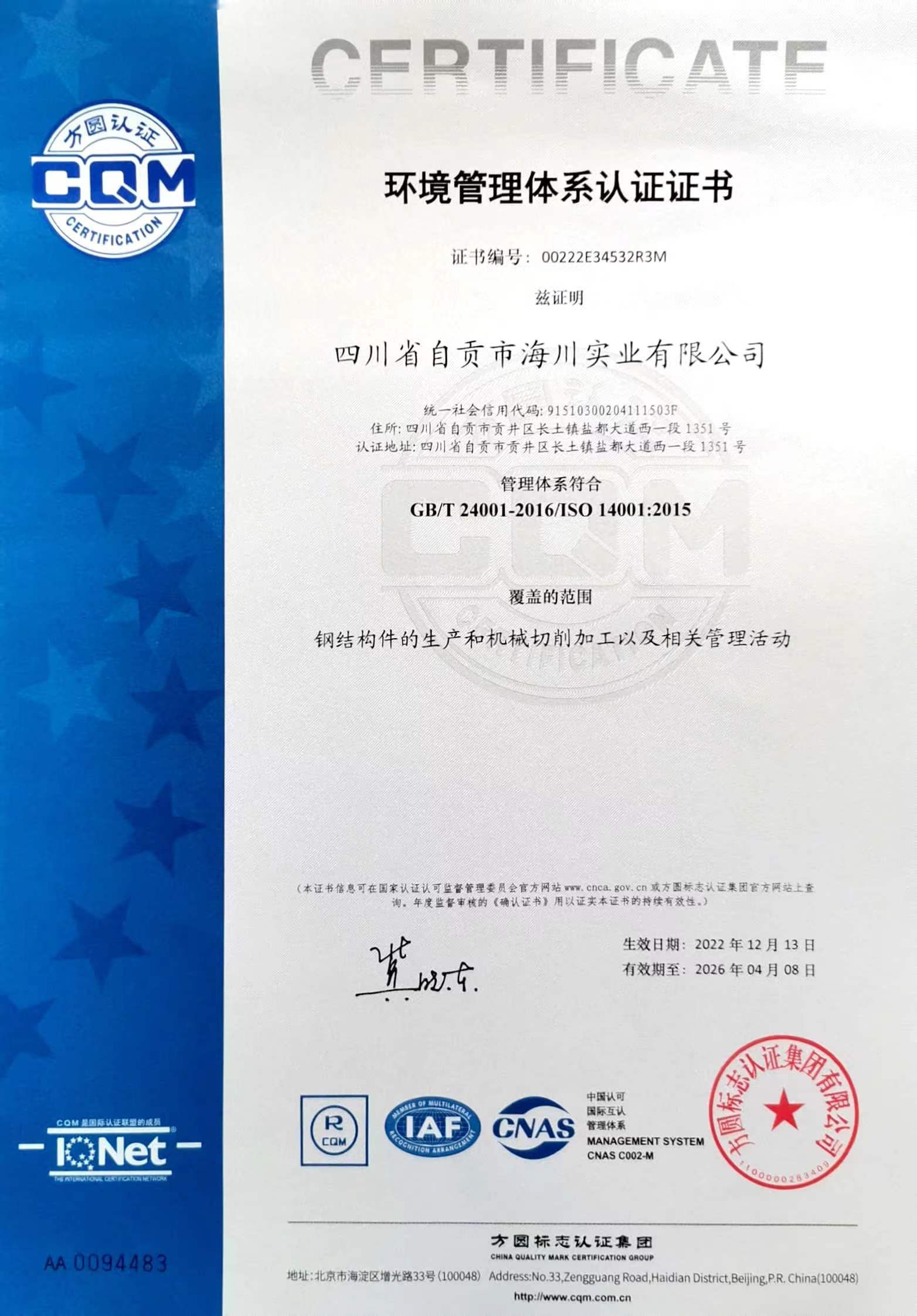 環(huán)境管理體系認(rèn)證證書(shū)(中文版)